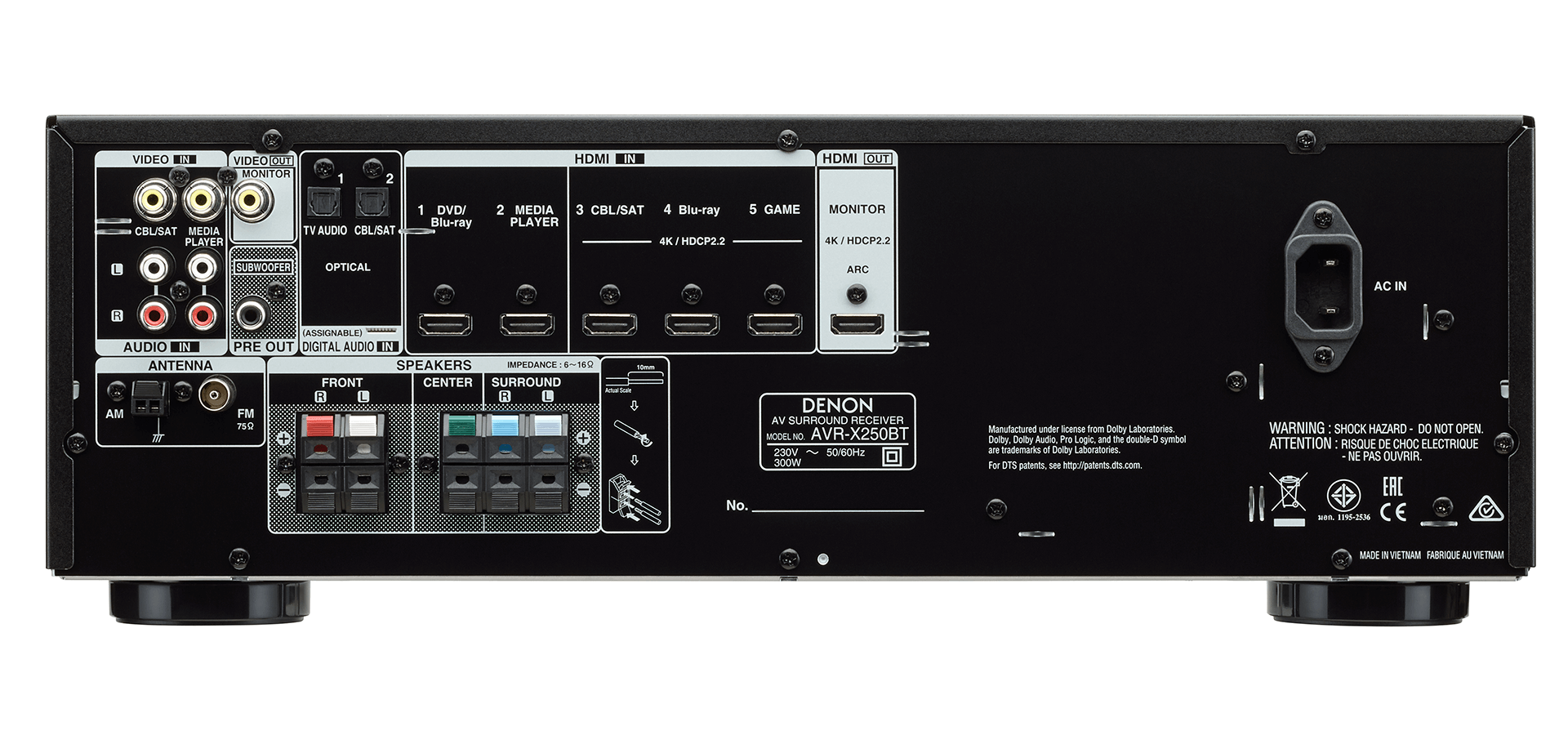 Perteneciente a la Serie X de Denon, el receptor AV AVR-X250BT ofrece un cine en casa de calidad con 130 W por canal. Podrás disfrutar de tus peliculas y programas favoritos con Full 4K Ultra HD, Dolby TrueHD y DTS-HD en las cinco entradas HDMI y compatibilidad con HDCP 2.2 en tres entradas. El AVR-X250BT de 5.1 canales dispone de Bluetooth para que puedas transmitir música de forma inalámbrica desde cualquier dispositivo compatible y es capaz de memorizar hasta ocho dispositivo emparejados para que tus familiares y amigos también puedan escuchar sus canciones favoritas. Y con el Asistente de instalación, ponerlo en marcha es pan comido. Además, el gran saber hacer de Denon en materia de sonido te garantiza que disfrutarás de las tecnologías más avanzadas y de los más altos niveles de calidad en todas tus experiencias auditivas.